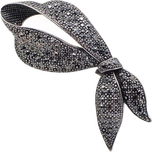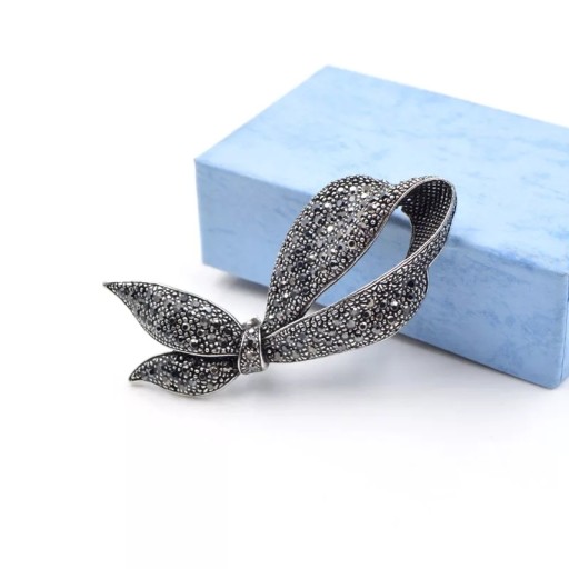 ✔️ Broszka kokarda wykonana ze stopu jubilerskiego o najwyższej czystości. Wysadzana cyrkoniami w kolorze markazytów. Broszka jest sporych rozmiarów i dzięki starannemu wykonaniu przykuwa wzrok niemal każdej osoby.