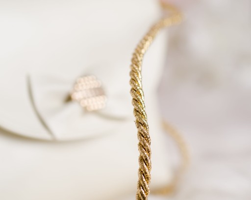 Torebka w kolorze ecru ze złotym sznurkiem oraz złotym elementem dekoracyjnym. Torebka wykonana z wysokiej jakości ekoskórki.