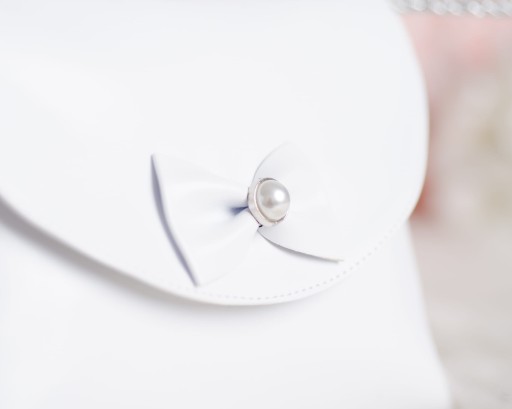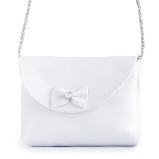 Torebka komunijna w kolorze białym ze srebrnym sznurkiem oraz elementem dekoracyjnym. Torebka wykonana z wysokiej jakości ekoskórki.