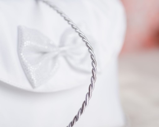 Torebka komunijna w kolorze białym ze srebrnym sznurkiem z białą kokardką. Torebka wykonana z wysokiej jakości satyny.