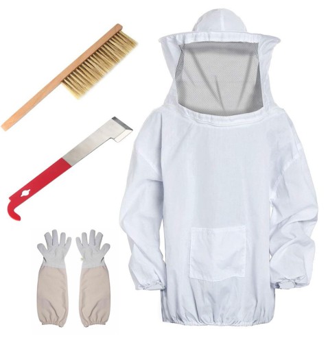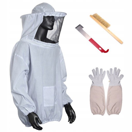 Pakiet zawiera: jest kombinezon pszczelarski, rękawice pszczelarskie, szczotka do pszczół i skrobak, wygodny i praktyczny.
