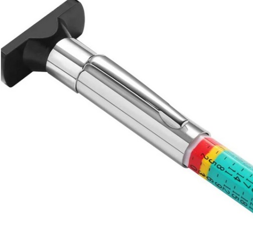 Prosty w obsłudze miernik głębokości bieżnika opon, mierzący w zakresie od 0 do 25 mm. Zbudowany z wysokiej jakości materiałów, łączy w sobie trwałość tworzyw sztucznych i niezawodność stali nierdzewnej. Wyposażony w praktyczny klips do mocowania, co ułatwia jego noszenie. Instrument ten zwiększa bezpieczeństwo jazdy, umożliwiając precyzyjne sprawdzenie stopnia zużycia bieżnika. Jego czytelne oznaczenia gwarantują szybkość i precyzję pomiarów. Jest wszechstronny i odpowiedni do użytku w różnych typach pojazdów, w tym w samochodach ciężarowych, motocyklach i autach osobowych. Aby zmierzyć głębokość bieżnika, wystarczy wsunąć metalowy czujnik w bieżnik opony i odczytać wynik, dociskając do opony czarną płaską część miernika.