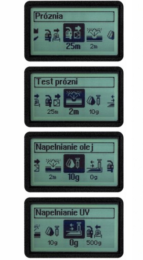 - Tryb manualny– umożliwia wprowadzenie wszystkich parametrów takich jak czas próżni, ilość oleju oraz ilość gazu ręcznie, dzięki temu trybowi każdy etap możemy wykonać osobno.