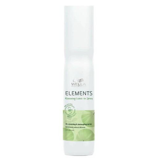 Wella Professionals Elements Renewing Leave-in Spray wygładza i chroni włosy przed nadwyrężeniem mechanicznym (podczas czesania czesania lub używania urządzeń termicznych) oraz łamliwością. Jednocześnie nawilża i poskramia włosy elektryzujące się lub mocno skręcone. Kosmetyk w 99% składa się ze składników naturalnego pochodzenia, a jego formuła nie zawiera silikonów i pozbawiona jest składników pochodzenia zwierzęcego. Butelkę wykonano w 80% z recyklingowanego plastiku.Nowa linia Elements Renewing to delikatny program dla wszystkich rodzajów włosów oraz normalnej lub tłustej skóry głowy. Kosmetyki wskazane są także do pielęgnacji włosów farbowanych farbą tradycyjną lub roślinną, po zabiegu z keratyną lub chemicznym. Wella Elements Renewing przywraca włosom gładkość oraz połysk, jednocześnie chroniąc je przed mechanicznym nadwyrężeniem. Starannie dobrane składniki naturalnego pochodzenia, podbudowane wiedzą naukową, wydobywają piękno włosów. Łagodne siły natury zapewniają witalność, równowagę i czystość. Intensywnie działające formuły zawierają od 91% do 99% składników pochodzenia naturalnego, nie zawierają silikonów oraz składników pochodzenia zwierzęcego ani produktów ubocznych.