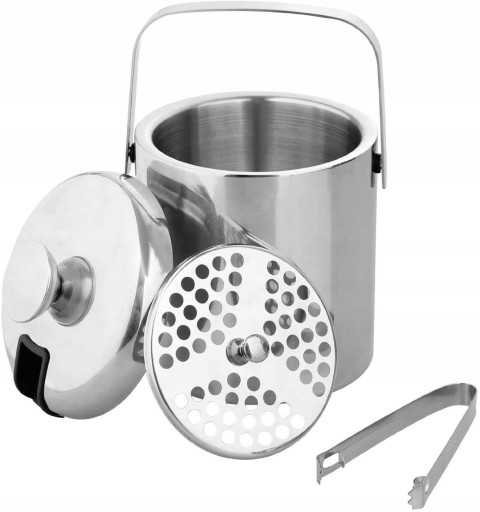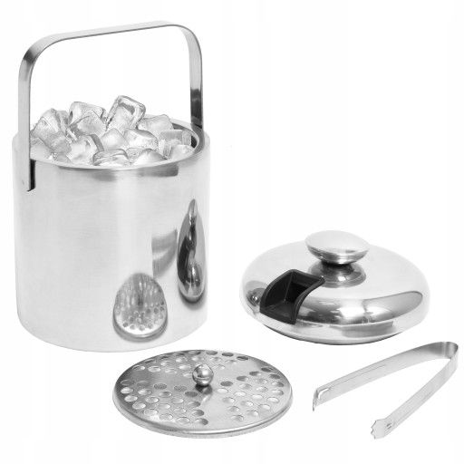 Wykonane z wysokiej jakości stali nierdzewnej. Świetny sposób na przechowywanie lodu poza warunkami chłodniczymi (np. w trakcie wspólnego grilla). Model wyposażony w szczypce do nakładanie kostek lodu. Pokrywa pojemnika posiada specjalną kieszeń na szczypce, dzięki czemu mamy je zawsze pod ręką. Wiaderko z wygodnym uchwytem do przenoszenia. Pojemnik ma specjalną próżniową budowę, która gwarantuje długi czas nietopnienia lodu. Wewnątrz pojemnika znajduje się sitko utrzymujące lód nad warstwą wody stopionych kostek lodu.