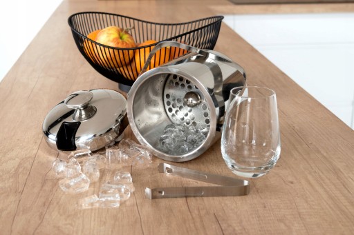 - POKRYWKA, SITKO, ŁYŻECZKA I SZCZYPCE W ZESTAWIE - pokrywka jest niezwykle funkcjonalna, posiada kieszonkę, która umożliwia przechowywanie szczypiec. Istotnym dodatkiem w zestawie jest sitko, które utrzymuje lód nad warstwą wody powstałą w wyniku jego powolnego topnienia. W zestawie znajduje się również łyżka barmańska oraz szczypce do lodu.
