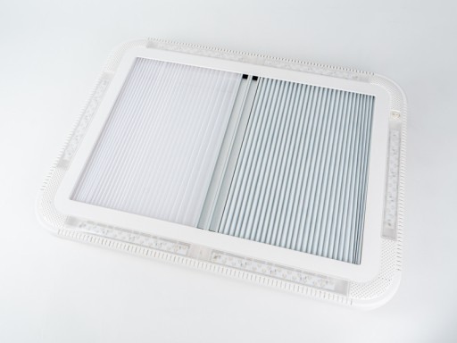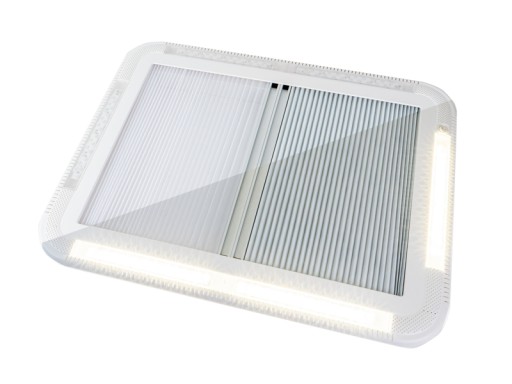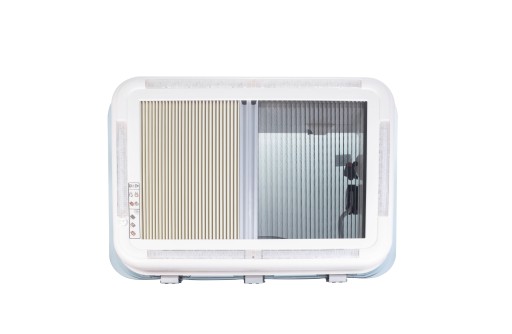 Okno dachowe dedykowane do montażu w kamperach oraz przyczepach kempingowych. Posiada podwójne, przyciemnione przeszklenie akrylowe z powłoką ochronną UV. Okno wyposażone jest w zintegrowaną plisowaną roletę, moskitierę oraz oświetlenie LED. Jest ciche i szczelne dzięki zastosowaniu wysokiej jakości sylikonowych uszczelek.
