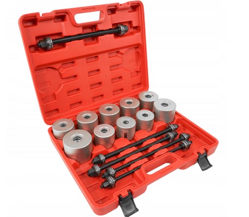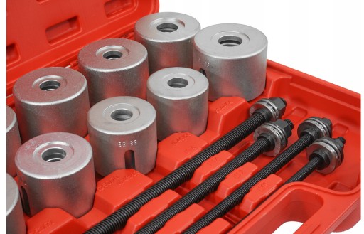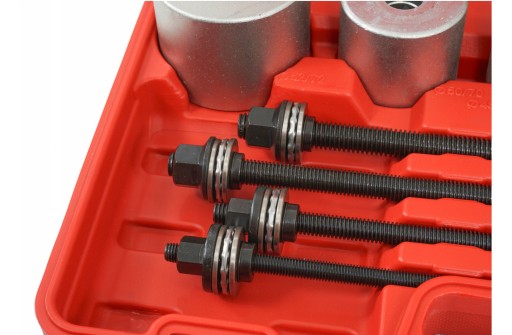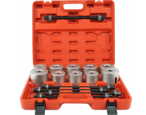 Zestaw do wciskania i wyciskania łożysk, tulei i sworzni zawieszenia. Może być używany bezpośrednio na samochodzie.