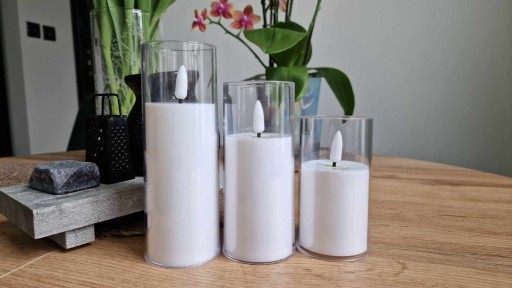 (tym razem świeczka w szkle przeżroczystym kolor świecy , po zapaleniu robi sie lekko żółtawa przypominając kolor wosku , świeca jest już z bateriami w komplecie )