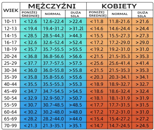 Tabela wyników dla odpowiednich grup wiekowych oraz płci znajduje się na zdjęciu w galerii aukcji