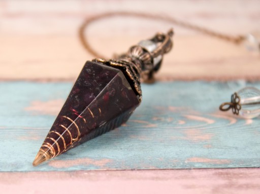 Wahadełko orgonitowe z granatem i czystą miedzią- kamień pewności siebie i odwagi, który pomaga przezwyciężyć nieśmiałość i podejmować trudne decyzje w życiu.