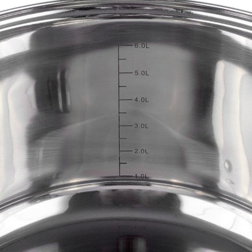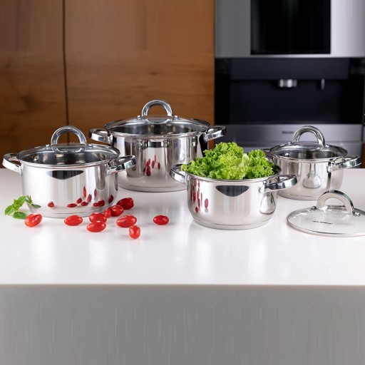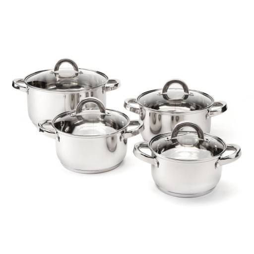 Garnki wykonane ze stali nierdzewnej. W skład kompletu wchodzi: -garnek z pokrywą 16 x 10,5 cm; poj. 1.9l - garnek z pokrywą 18 x 11,5 cm; poj. 2,6l - garnek z pokrywą 20 x 12,5 cm; poj. 3,6l - garnek z pokrywą 24 x 14,5 cm; poj. 6,1l - grubość ścianki 0.5mm. Szklane pokrywy, uchwyty ze stali nierdzewnej, indukcja, nadaje się do zmywarki.