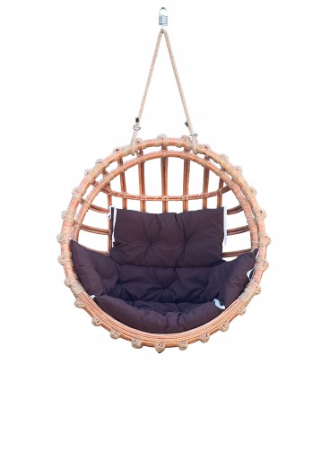 Przedmiotem tej aukcji jest okrągła wiklinowa huśtawka ogrodowa wisząca w naturalnym kolorze wraz z brązową poduszką.