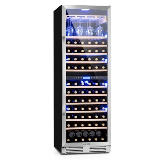 Perfekcyjna prezentacja: Wysokiej jakości pojemna dwustrefowa chłodziarka na wino z drzwiami szklanymi i ramą ze stali szlachetnej oraz z 3-kolorowym oświetleniem wnętrza w kolorze niebieskim, czerwonym lub białym i miejscem na 165 butelek wina.