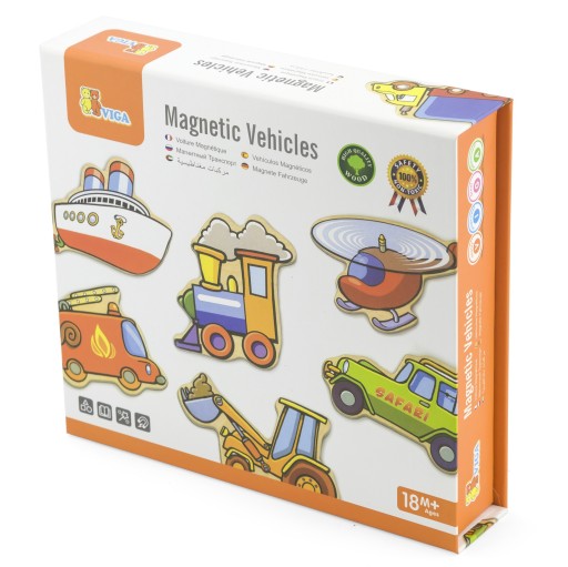 Drewniany zestaw magnesów Pojazdy od firmy Viga to świetna układanka, która kształtuje zdolności manualne, pomaga opanować pierwsze znajomości pojazdów. W skład wchodzi 20 różnych magnesów. Można je przyczepiać do tablicy magnetycznej oraz lodówki. Teraz bez trudu Twoje dziecko posiądzie wiedzę wczesno przedszkolną.