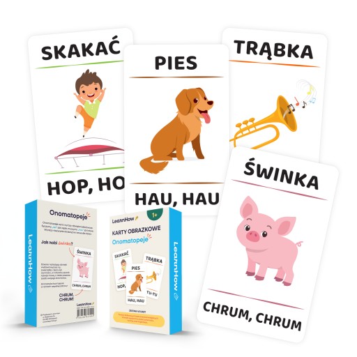 Zestaw zawiera aż 45 kolorowych kart z nazwami zwierząt, rzeczy oraz czynności, a także związane z nimi wyrazy dźwiękonaśladowcze!