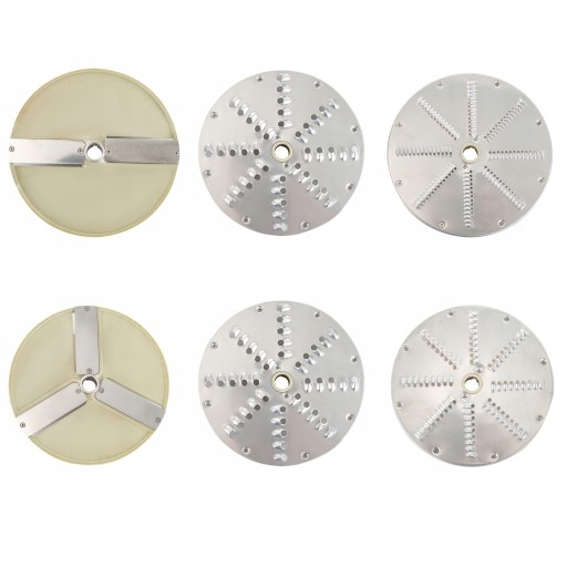 W zestawie 6 różnych tarcz tnących, które można odłączyć, łatwo wyczyścić i zainstalować. Potrafi kroić warzywa i owoce w różnych kształtach.