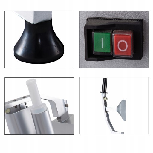 Antypoślizgowe gumowe nóżki zwiększają stabilność; wyłącznik ON/OFF z osłoną zapewnia bezpieczeństwo; Drążek do karmienia zapobiega zranieniu rąk; Ergonomiczny uchwyt ułatwia cięcie.