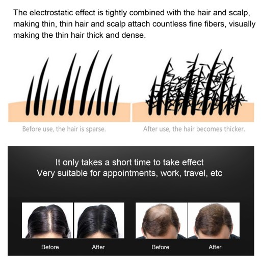 2. Efekt elektrostatyczny ściśle łączy się z włosami i skórą głowy, dzięki czemu cienkie, cienkie włosy i skóra głowy przyczepiają niezliczoną ilość drobnych włókien, wizualnie sprawiając, że cienkie włosy stają się gęste i gęste.