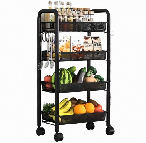 Uniwersalny regał idealnie nadający się do różnych pomieszczeń, takich jak kuchnia, łazienka, salon lub sypialnia, pozwala na zagospodarowanie wąskiej przestrzeni i ułatwia dostęp do potrzebnych przedmiotów. Regał posiada trzy półki, które pomieszczą wiele różnych akcesoriów, a także cztery kółka, z których dwa są blokowane hamulcem. W zestawie znajdują się również pięć haczyków, które mogą być zamontowane po lewej lub po prawej stronie na dowolnym poziomie. Regał jest wykonany z najwyższej jakości materiałów, a jego konstrukcja z stalową została pomalowana proszkowo na czarny, błyszczący kolor.