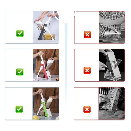Bezpieczny przecinak - nie ma potrzeby wymiany wielu ostrzy. Wbudowana konstrukcja ostrzy zapobiega możliwości dotknięcia ostrzy, dzięki czemu nie potrzebujesz już rękawic ochronnych. Na nóżkach produktu znajdują się przyssawki, dzięki którym rozdrabniacz mandolinowy pozostaje bardzo bezpieczny na miejscu podczas siekania.