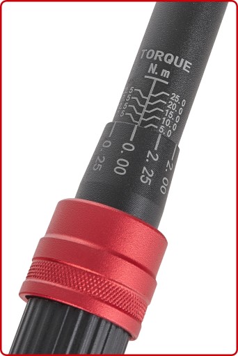Klucz posiada czytelną skalę nastaw w dwóch jednostkach, z dodatkową mikro skalą, która umożliwia precyzyjne ustawienie siły dokręcania.