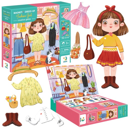 Zestaw ten zawiera tablicę magnetyczną oraz 32 magnesy z różnorodnymi elementami ubioru, umożliwiając małym projektantom tworzenie własnych stylizacji i eksperymentowanie ze stylem.