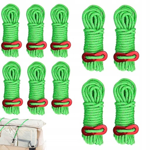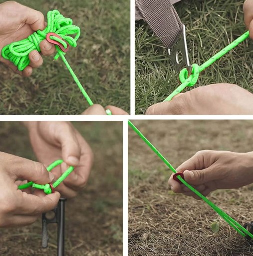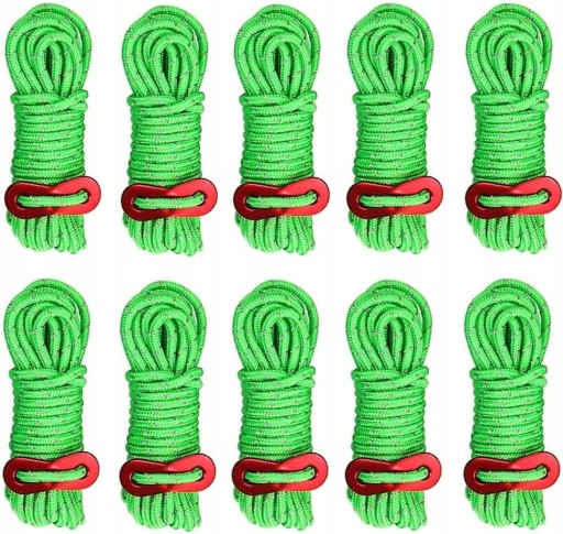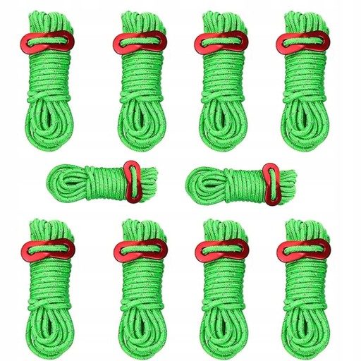 - [Rozmiar] Każda linka ma 4 metry długości i średniej 4 mm. Każda linka może być obciążona do 200 kg. Łącznie 10 sztuk linek namiotowych wchodzących w zakres dostawy