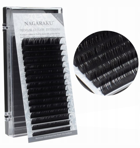 Rzęsy na taśmie Nagaraku o różnej długości 16 linii są produkowane w grubości: 0,03 mm, 0,05 mm, 0,07 mm, 0,10 mm, 0,12 mm, 0,15 mm, 0,20 mm, 0,25 mm;