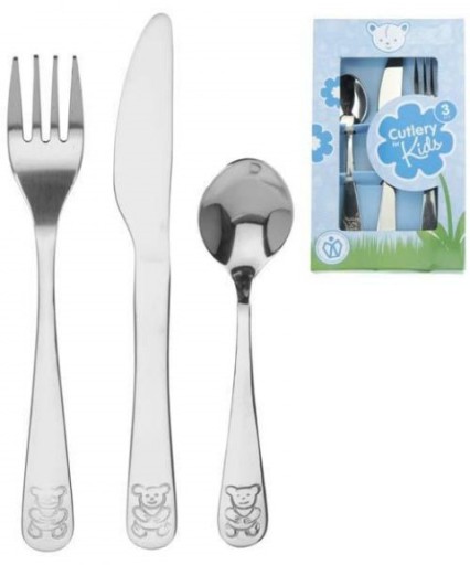 Komplet 3 sztućców dla dzieci ze stali nierdzewnej. Zaprojektowane specjalnie dla małych rąk, ze wzorem misia na uchwytach.