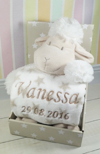- Oferujemy rewelacyjny komplet - kocyk z mikrofibry z wyhaftowanym imieniem oraz wybranym obrazkiem plus maskotka - OWIECZKA