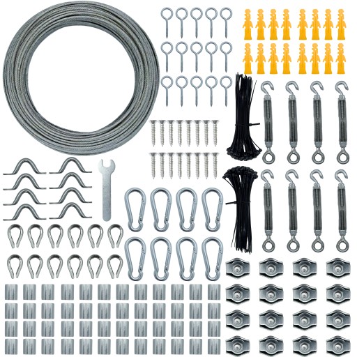 KOMPLETNY ZESTAW - zawiera 1 linkę 60 m/2 mm, 8 napinacze linowe, 16 kołków rozporowych i śrub, 50 aluminiowych pętli zaciskowych, 15 haków oczkowych, 16 zacisków linowych, 12 pętli aluminiowych, 8 szekli, 8 uchwytów 1 klucz, zestaw opasek zaciskowych