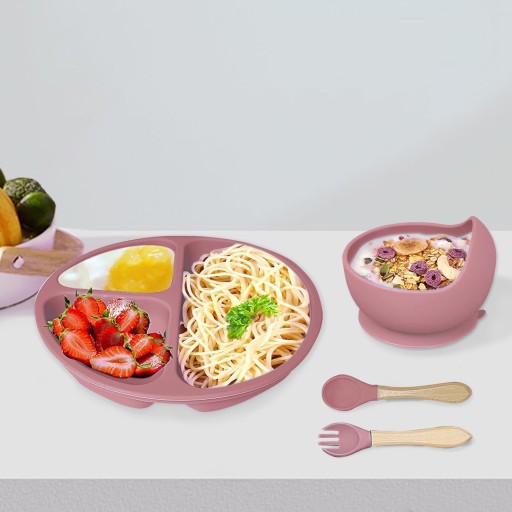 talerz dla dzieci wykonany jest z silikonu bezpiecznego dla żywności, wolnego od BPA i PCV, miękkiego i bezpiecznego materiału, bezwonnego i odpornego na kapanie. Jest bezpieczniejsza i trwalsza niż zastawa stołowa z tworzywa i szkła, można ją złożyć i zabrać do torby. Silikonowa łyżeczka pomaga stymulować dziąsła i łagodzić lęk związany z ząbkowaniem w początkowej fazie, nie powodując przy tym szkody dla dziecka.