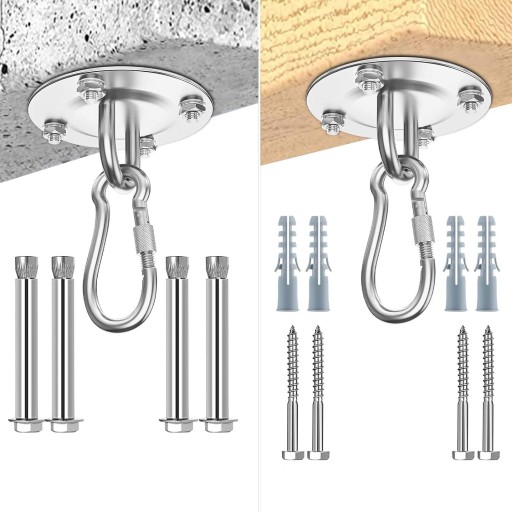 ✅【Łatwy w montażu】 Nasz zestaw zawiera 4x śruby rozporowe, 4x wkręty, 4x śruby sześciokątne, 1x klamrę ze stali nierdzewnej, 1x pierścień obrotowy, 1x wspornik sufitowy do montażu na drewnie, mamy wstępnie wywiercone otwory, które można łatwo przymocować do dowolnego solidnego sufitu, na ścianach i drewnianych belkach.