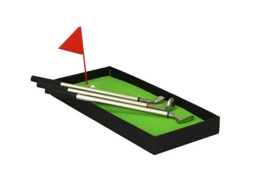 W upominkowym eleganckim czarnym pudełku znajdziesz trzy słusznych rozmiarów długopisy (aż 19 cm! długości) - będące świetnym odwzorowaniem prawdziwych kijów golfowych (driver, iron i putter). Ponadto wieczko pudełka jest jednocześnie mini polem golfowym (w dodatku zielonym) z dwoma dołkami, a w zestawie znajdziesz także dwie piłki golfowe oraz chorągiewkę. Zestaw sprawdza się podwójnie, dostarcza swoistych wrażań sportowych oraz daje przyjemność podczas korzystanie z niego jako przyboru do pisania. Postawienie bowiem choćby małej parafki takim golfowym długopisem to przy odrobinie fantazji jak trafienie w trzech uderzeniach do odległego dołka, nie wspominając już, że podpisanie ważnej umowy to już absolutne hole in one czyli zaliczenie dołka jednym celnym uderzeniem ;)