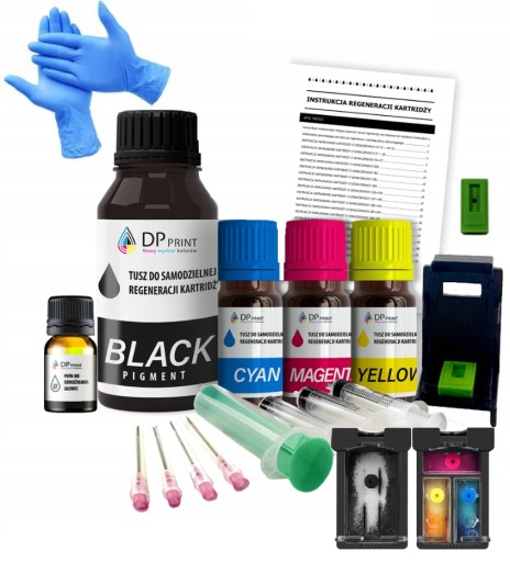 TUSZ CZARNY 140ML + TUSZ KOLOROWY 3X60ML + KLIP + AKCESORIA + PŁYN DO UDRAŻNIANIA GŁOWIC