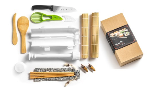 - w zestawie: 4 pałeczki bambusowe, 2 podstawki na pałeczki (kaczuszki), bambusowe maty, tuba (roller) do ryżu, nóż do przecinania rolki sushi, bambusowa łyżka do nakładania ryżu, bambusowa szpatułka do rozsmarowywania ryżu, nóż do awokado, tekstylny pokrowiec na pałeczki