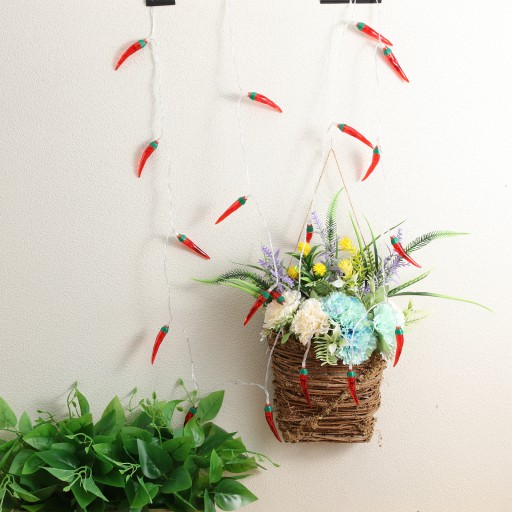 - Przewód o długości 3 m z 20 diodami LED, dekoracyjną lampką chili. Można go łatwo zakrzywić i ukształtować wokół roślin, okien, mebli itp. Przewód i dioda LED są wodoodporne, ale pojemnik na baterie nie.