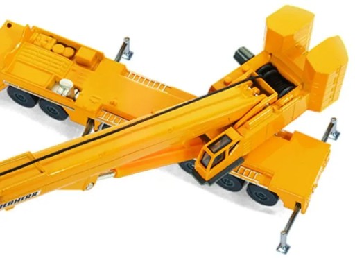 Przedstawiamy nowy dźwig samobieżny marki Liebherr. Model prawie całkowicie wykonany z odlewu metalu, przemieszcza się na 7-osiowym podwoziu z gumowymi oponami. Urządzenie obraca się o 1800. Wysięgnik ma regulowaną wysokość. Możliwość przedłużenia czterech metalowych wsporników.