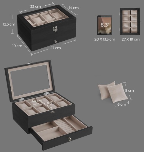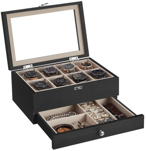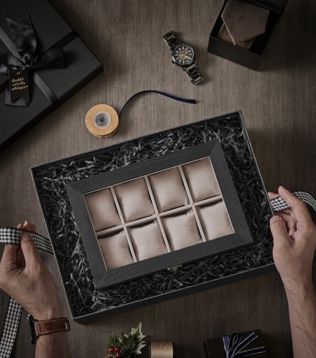 - Miejsce na Zegarki: Bez względu na to, czy to zegarki damskie, kwarcowe czy cyfrowe, 8 przegródek o wymiarach 8 x 6 cm każda pomieści je wszystkie.