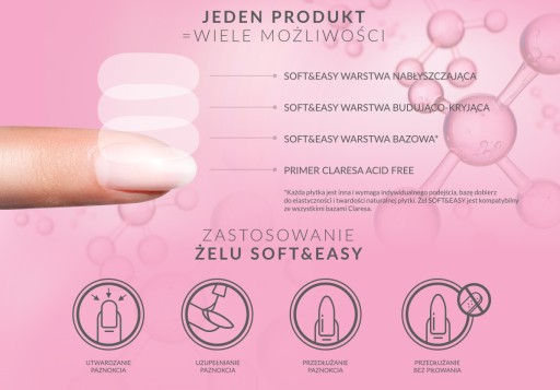 Innowacyjna formuła żelu o wyjątkowej strukturze i gęstości sprawia, że świetnie się poziomuje, przez co wybacza błędy nawet niezbyt doświadczonego użytkownika, szybką pracę ułatwia również zapobiegająca spływaniu na skórki tixotropia (pamięć cieczy). Stylizacja przy użyciu SOFT&EASY nie wymaga piłowania ani Topu – wystarczy przetrzeć warstwę dyspersyjną Cleanerem i intensywnie błyszczące paznokcie są gotowe!
