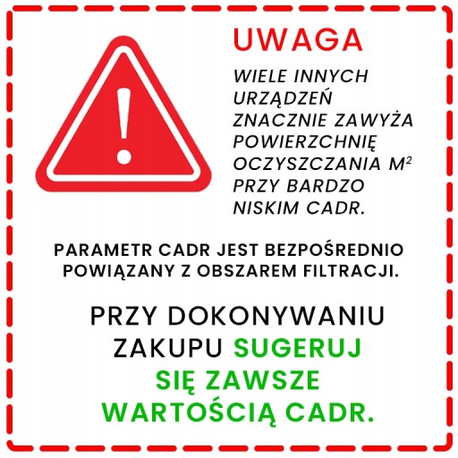 ❗️ UWAGA ❗️ Wiele urządzeń deklaruje znacznie wyższą powierzchnię oczyszczania przy niższym wskaźniku CADR (m3/h).