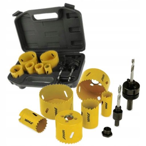 Zestaw DEDRA 08WZ01 składa się z dwóch sztuk uchwytów oraz sześciu sztuk otwornic bi-metalowych służących do wykonywania otworów w takich materiałach jak: metal, stal nierdzewna, metalach nieżelaznych, aluminium, drewnie czy w plastiku.