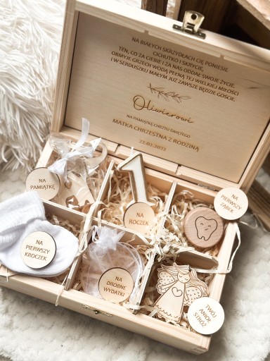 Drewniane pudełko wspomnień z przegródkami jako wyjątkowy prezent na chrzest, roczek lub inną okazję.