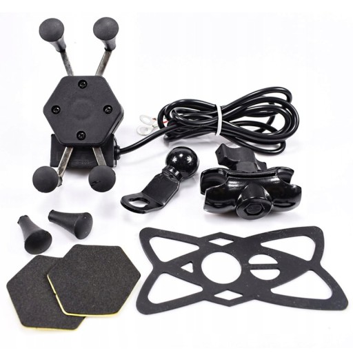 ✅ Uchwyt typu X z 4 ramionami zakończonymi gumowymi chwytakami, ładowarką USB, włącznikiem i kablem
