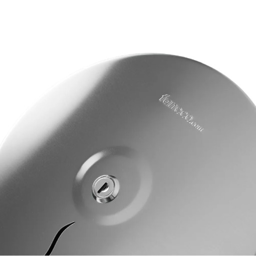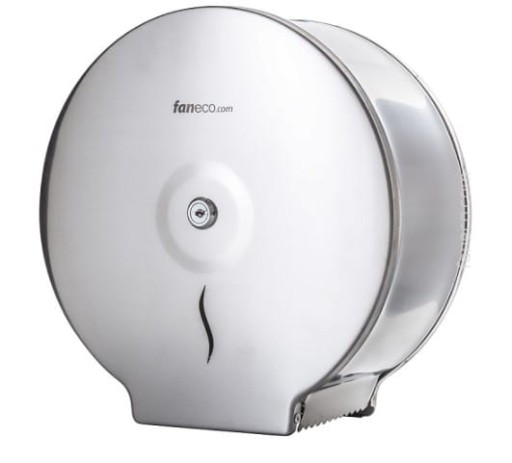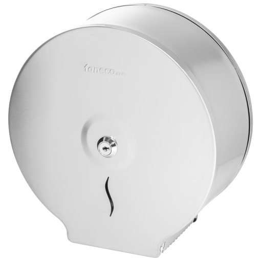 Solidny, duży pojemnik na papier toaletowy, wykonany z dobrej jakości szczotkowanej stali. Matowe wykończenie i gładka powierzchnia ułatwiają utrzymanie pojemnika w czystości. Dozownik jest przeznaczony do użytku w toaletach publicznych. Stal nierdzewna jest trwała i odporna na uszkodzenia. Dozownik mocuje się do ściany na wkręty, co dodatkowo zwiększa jego wytrzymałość. Wizjer pozwala na kontrolę bieżącego zużycia papieru toaletowego, a metalowy zamek i kluczyk zapobiega samoistnemu otwarciu i dostępowi osób trzecich.