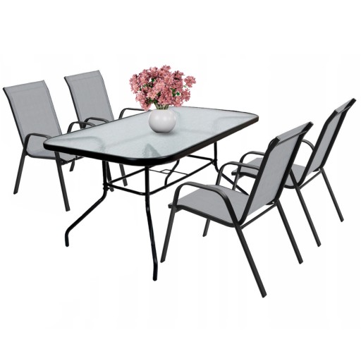 ⏩ ZESTAW MEBLI OGRODOWYCH DUŻY SZKLANY STÓŁ 140 × 80 cm + 4 KRZESŁA METALOWE SZARE