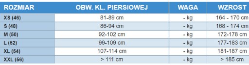 Dobór rozmiaru: Rozmiar Obw. kl. piersiowej Waga Wzrost XS (46) 81-89 cm - kg 164 - 170 cm S (48) 86-94 cm - kg 168 - 174 cm M (50) 92-102 cm - kg 172-178 cm L (52) 99-109 cm - kg 177-183 cm XL (54) 107-114 cm - kg 181-187 cm XXL (56) > 111 cm - kg > 185 cm DODATKOWE MATERIAŁY: Strona Producenta Kanał YouTube Katalog producenta 2022 Kod producenta 2022: 48222-4159