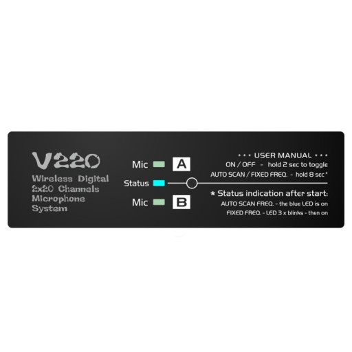 Moduł odbiornika mikrofonu bezprzewodowego. 2 kanały audio (możliwość równoczesnej pracy dwóch mikrofonów), 2x20 kanałów UHF. Zasięg mikrofonu bezprzewodowego: 30-60m.
