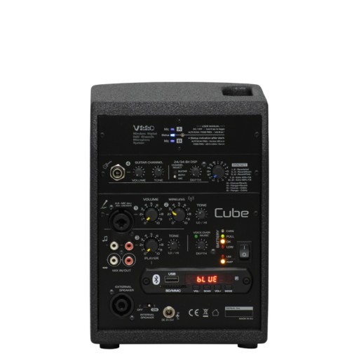 Cube LIGHT wyposażony w wbudowany procesor DSP z wejściem na gitarę oraz odbiornik mikrofonu bezprzewodowego V220.